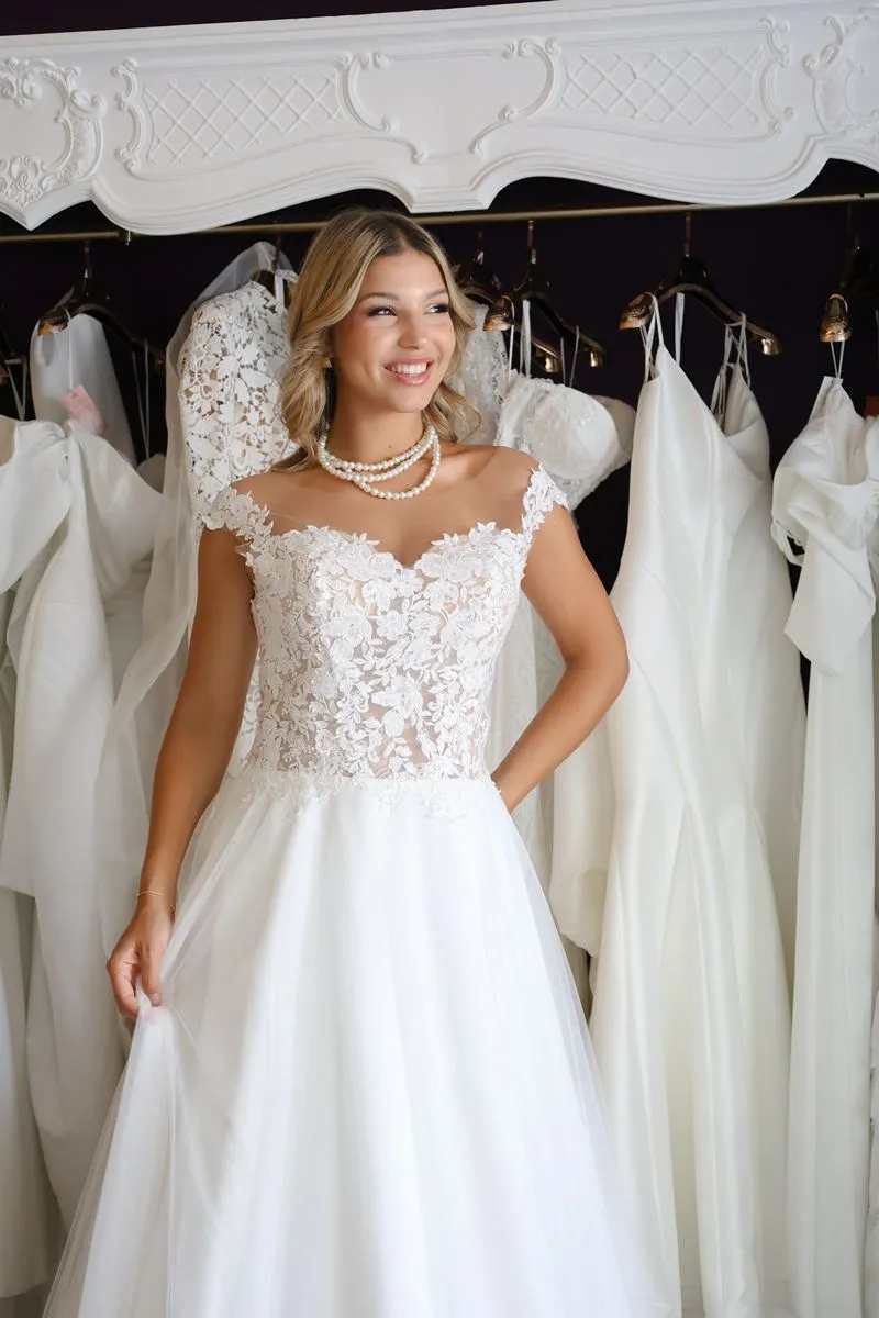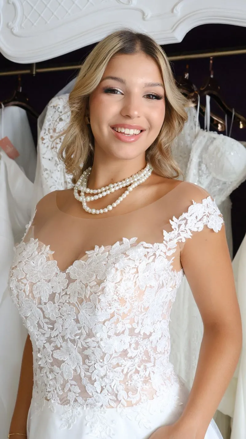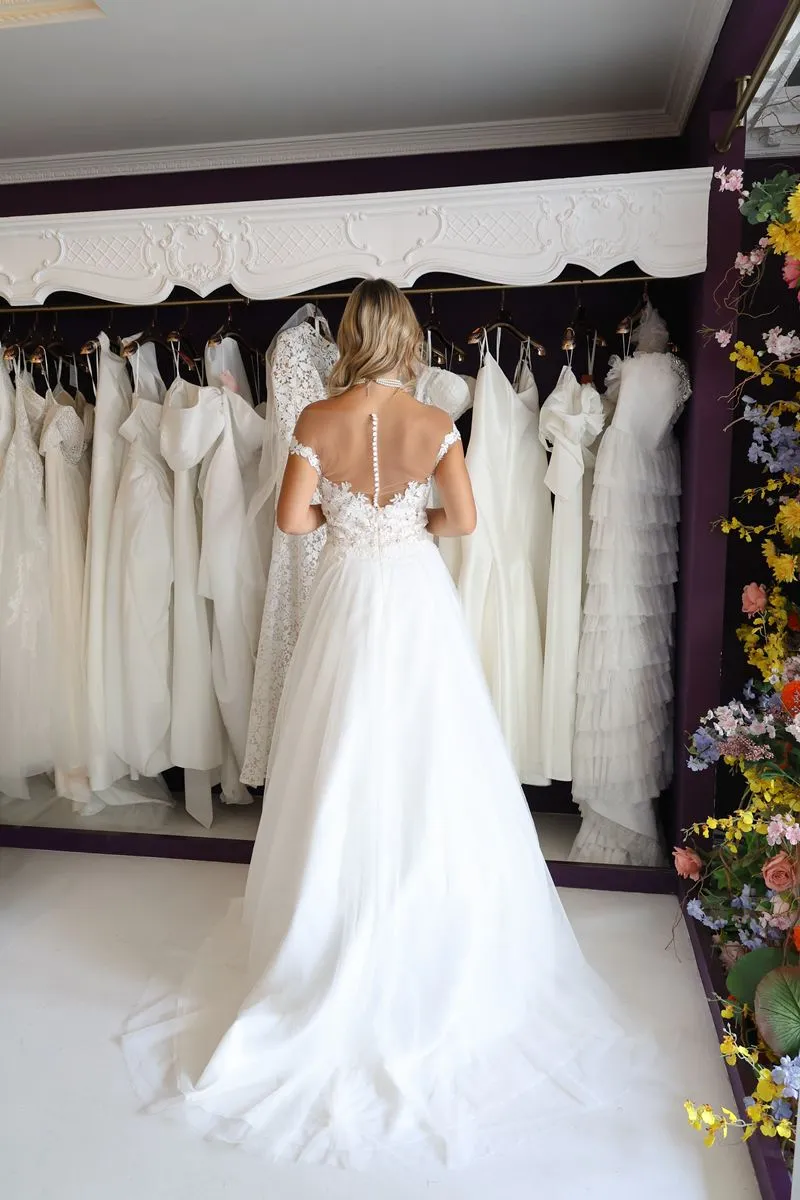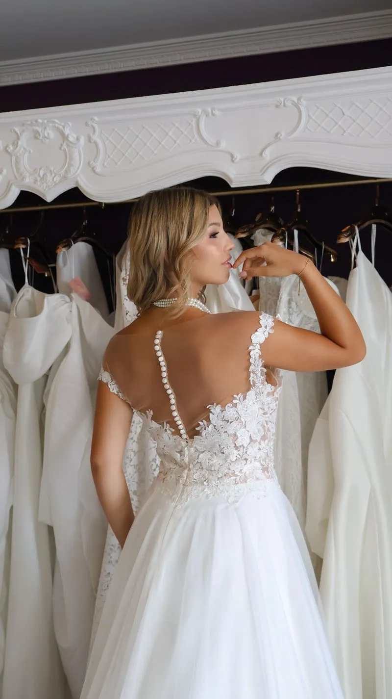 O modelo Alecrim foi pensado para noivas que preferem a delicadeza aos decotes pronunciados, sem abrir mão do encanto e da presença. Em estilo princesa, o vestido transmite romantismo e sofisticação, revelando nas costas um detalhe expressivo em renda que transforma o olhar e a silhueta.