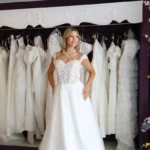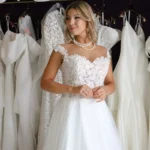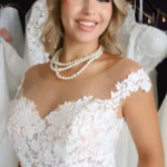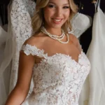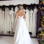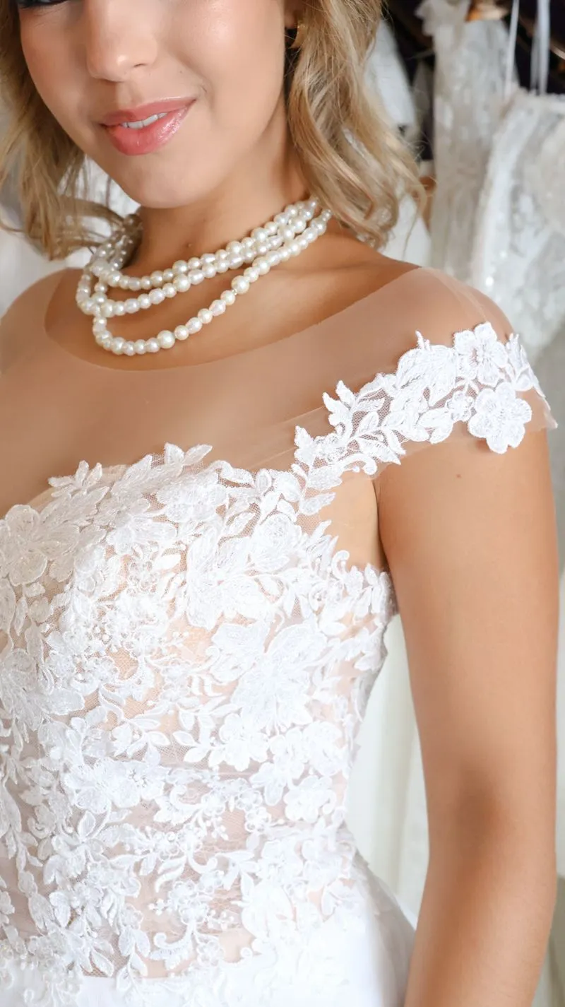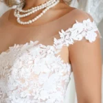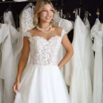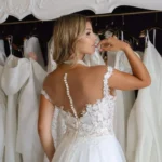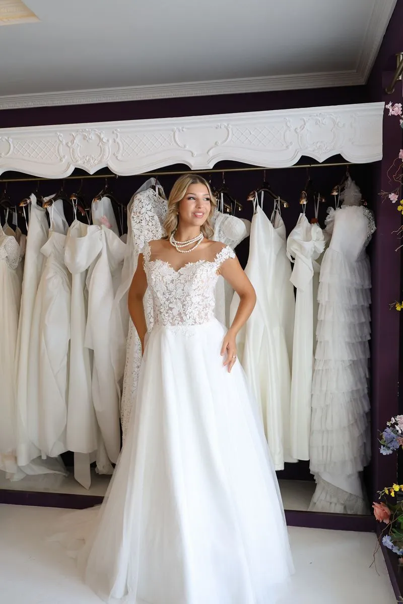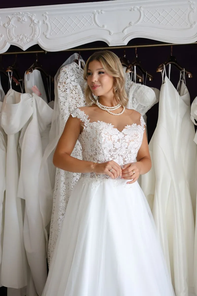O modelo Alecrim foi pensado para noivas que preferem a delicadeza aos decotes pronunciados, sem abrir mão do encanto e da presença. Em estilo princesa, o vestido transmite romantismo e sofisticação, revelando nas costas um detalhe expressivo em renda que transforma o olhar e a silhueta.