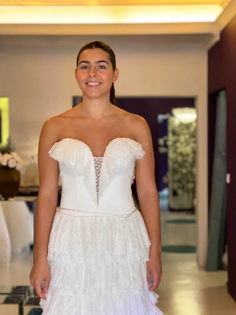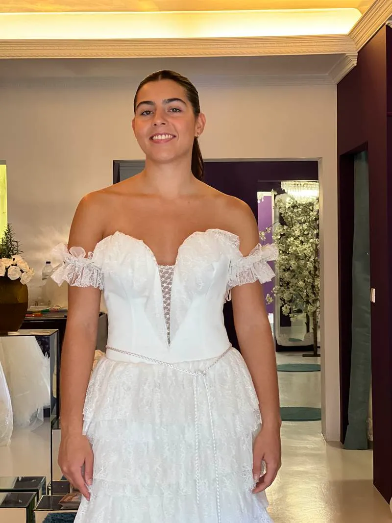 Vestido de noiva corte em “A” com folhos fluidos em renda e tule. Corpete cai-cai.