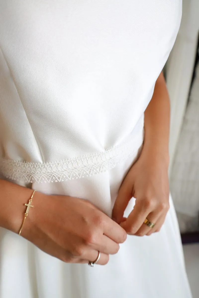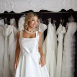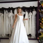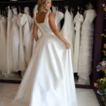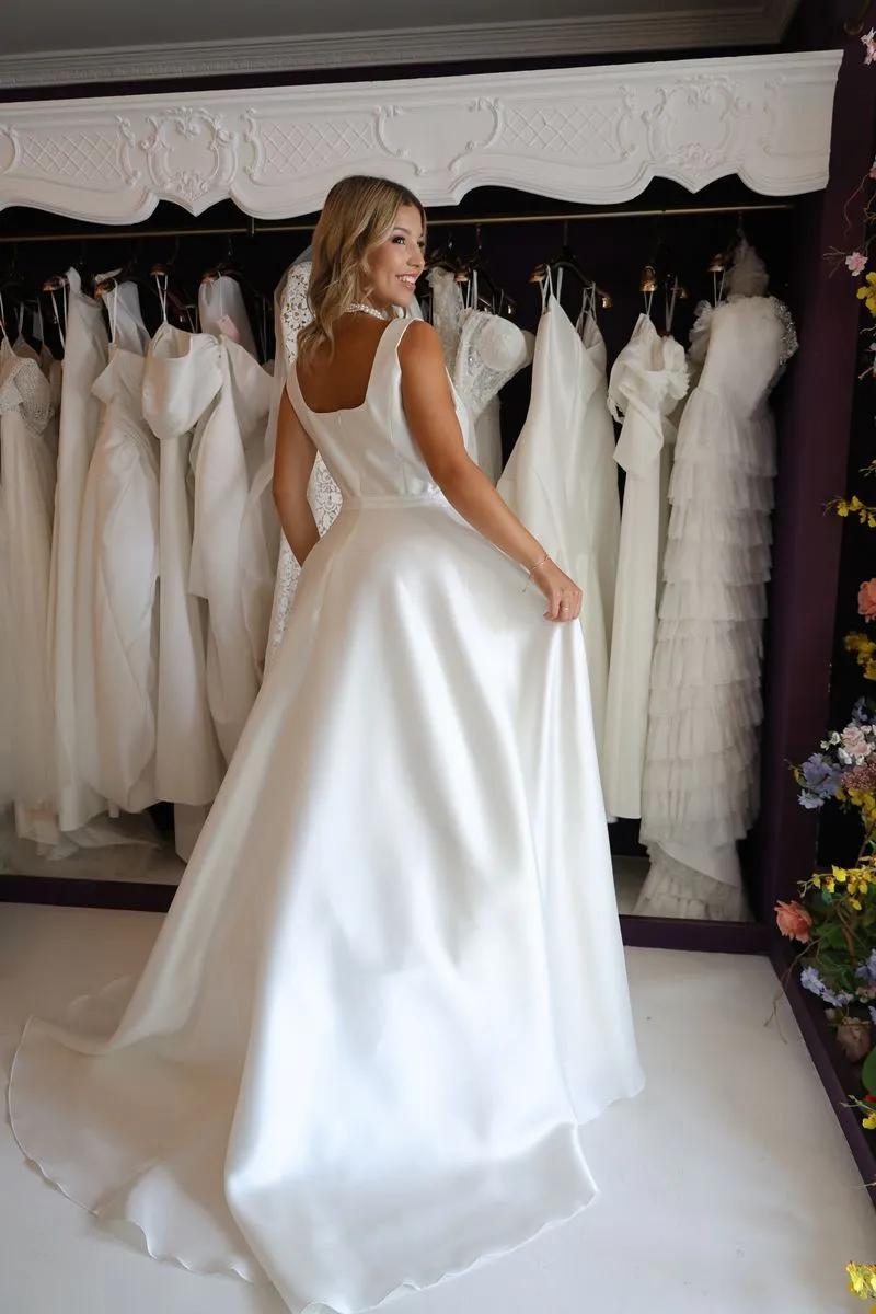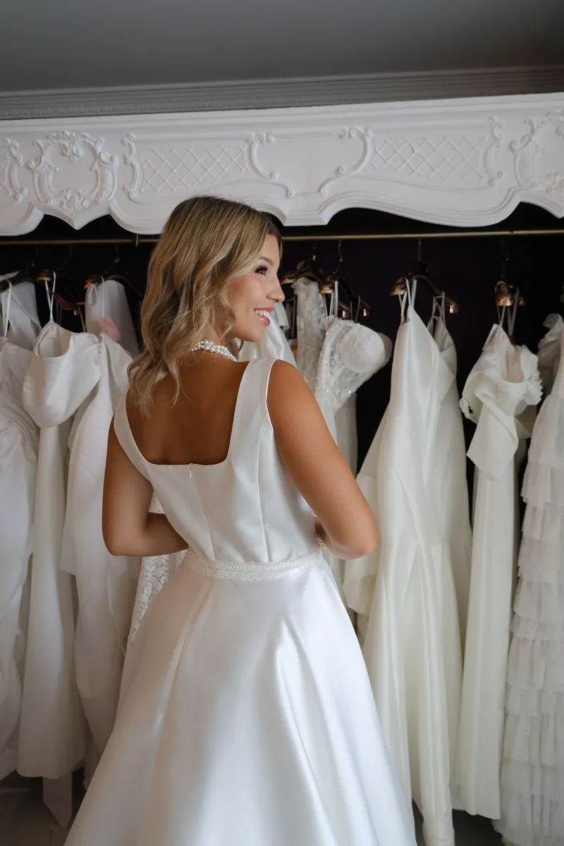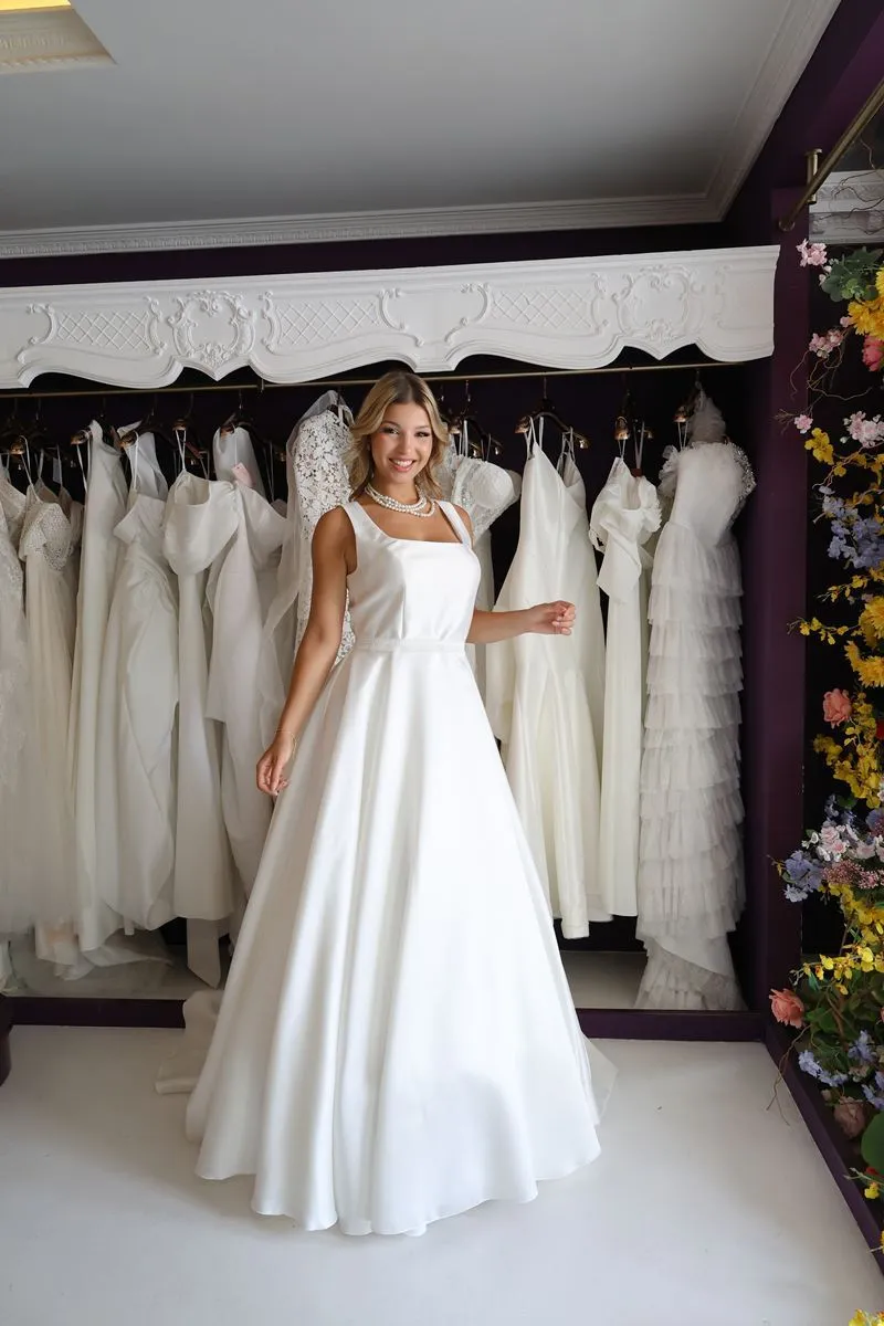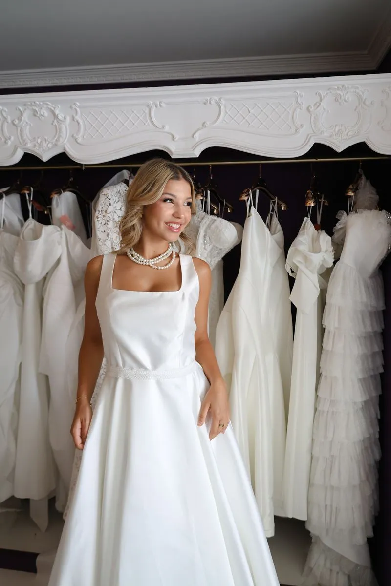 O modelo Chicago é uma criação especial da Momentus, pensado para valorizar a silhueta com elegância e sofisticação. Seu decote quadrado favorece especialmente as noivas com busto maior, criando proporções harmoniosas e uma presença única.
