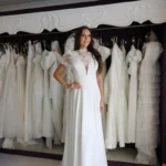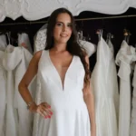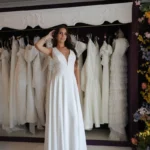 A sua delicadeza permite personalização: pode ser usado sozinho, em sua forma mais minimalista, ou ganhar novas dimensões com sobreposições e acessórios, tornando-se memorável e único — como a própria noiva que o escolhe. Um vestido pensado para eternizar o bem-estar e a autenticidade.