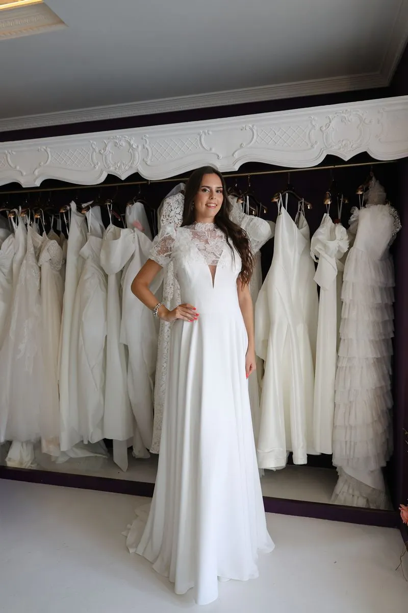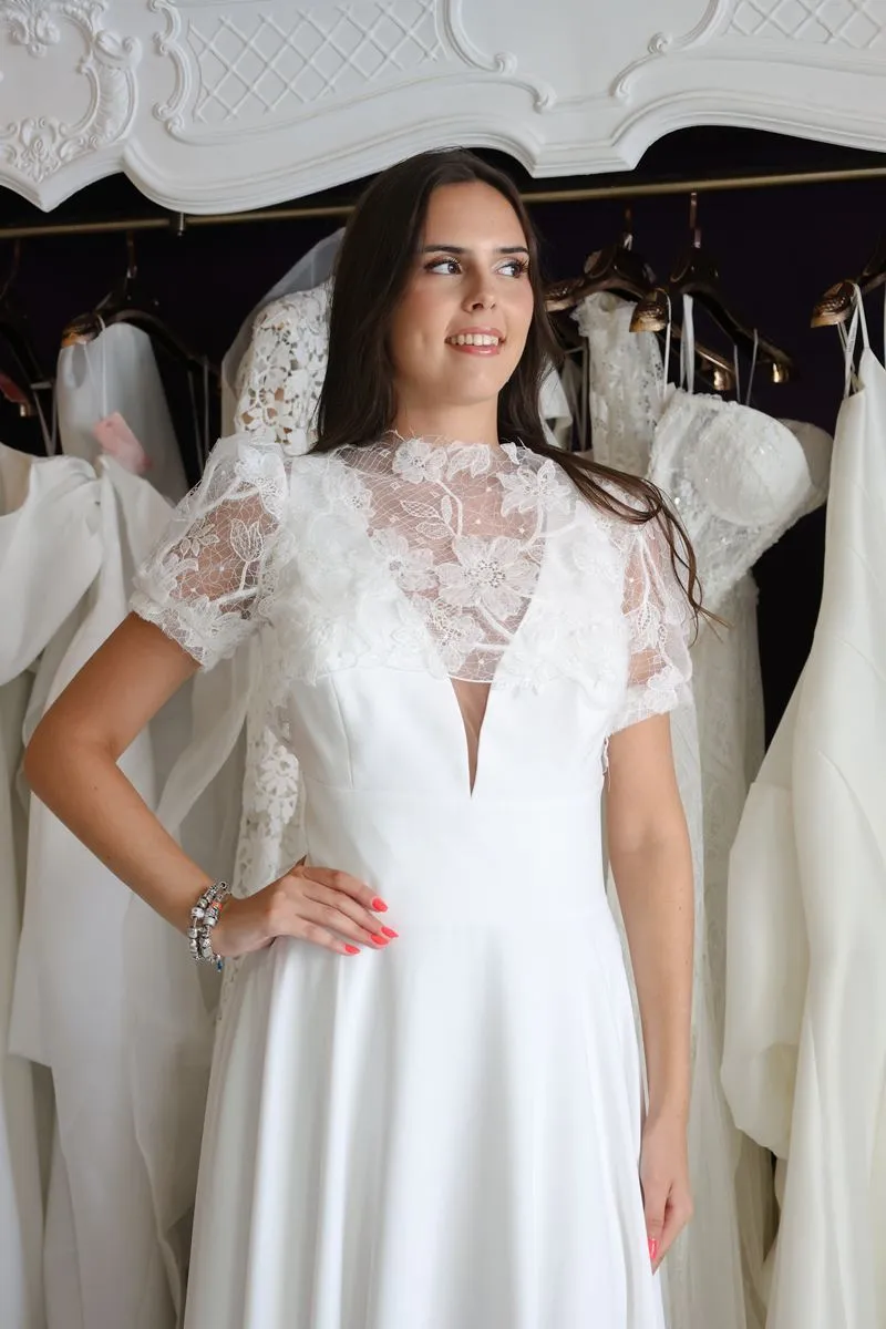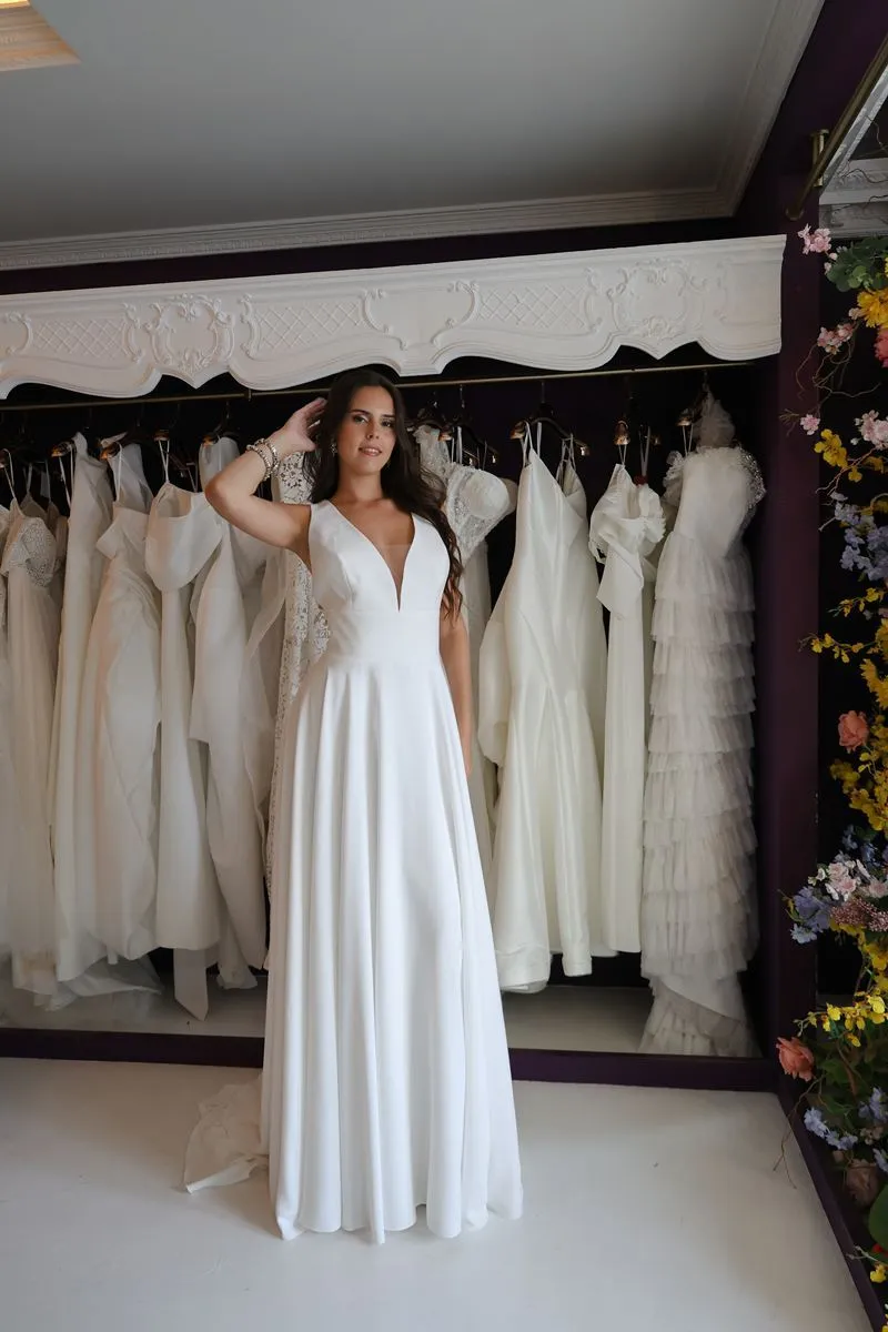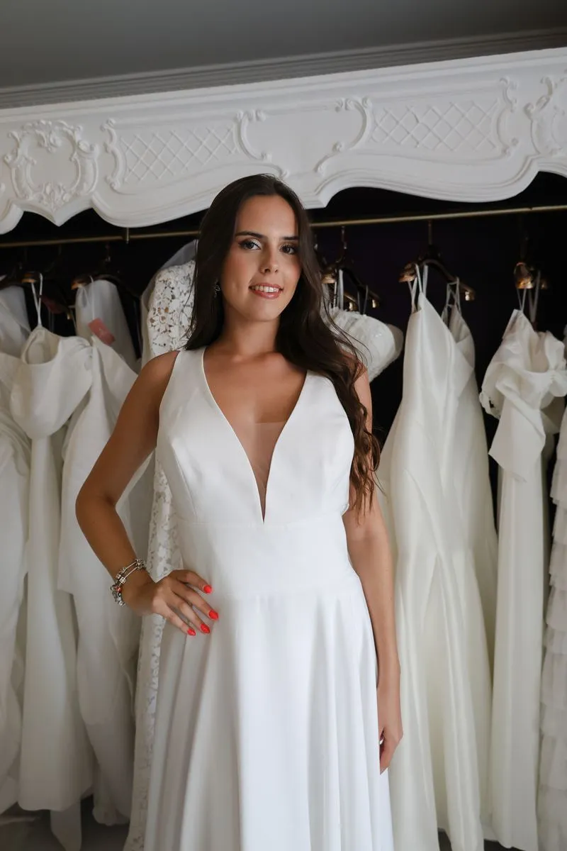 O modelo Fátima é a expressão da simplicidade elegante. Discreto e versátil, foi criado para favorecer qualquer tipo de corpo, com a prioridade de fazer a noiva sentir-se bem em cada momento.