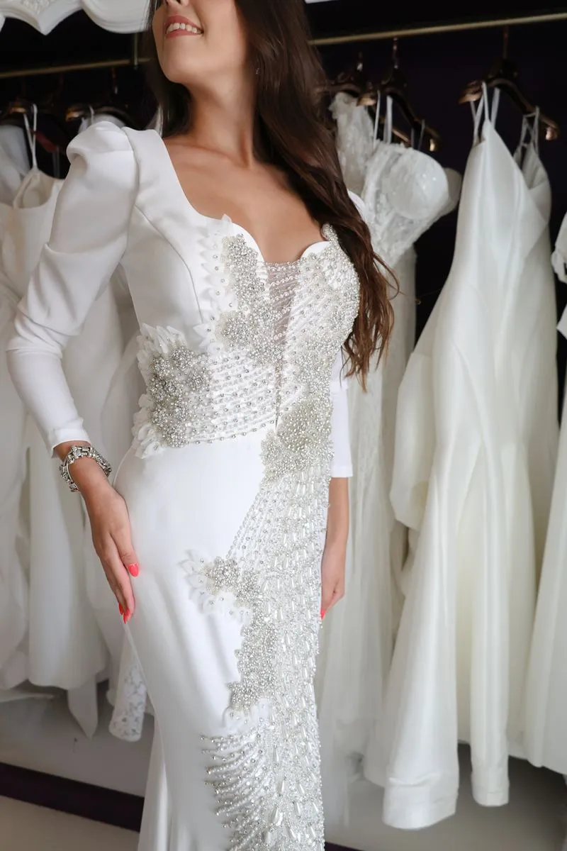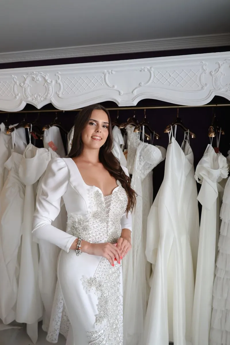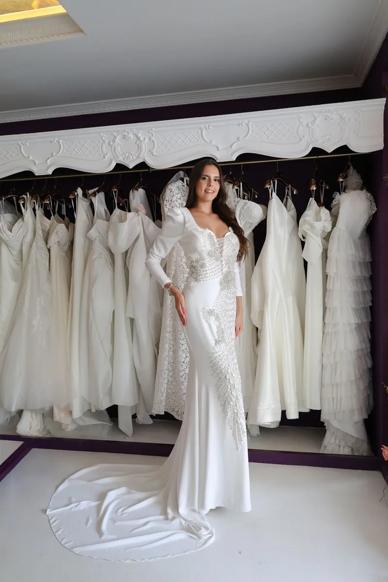 O modelo Ibiza foi criado para a noiva que deseja valorizar sua silhueta com ousadia e elegância. Pensado para transmitir excentricidade na medida certa, o vestido aposta no brilho e nas pérolas — uma das grandes tendências de 2026 — como protagonistas de seu design.