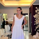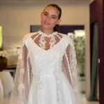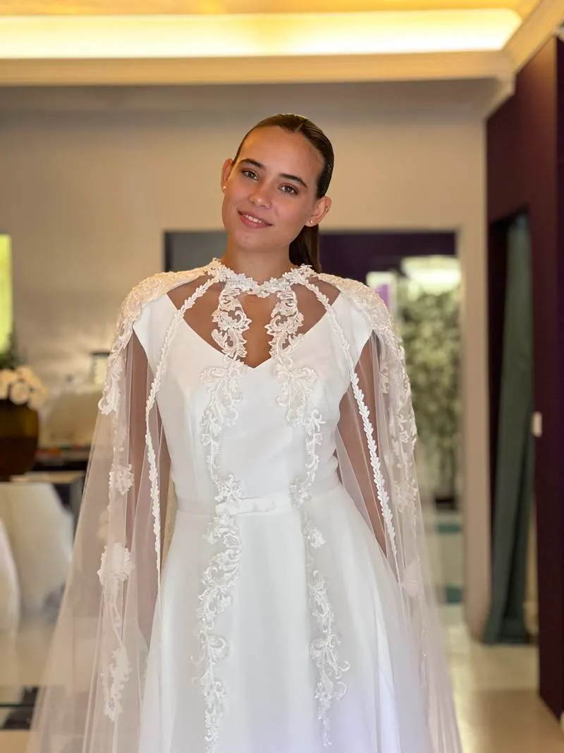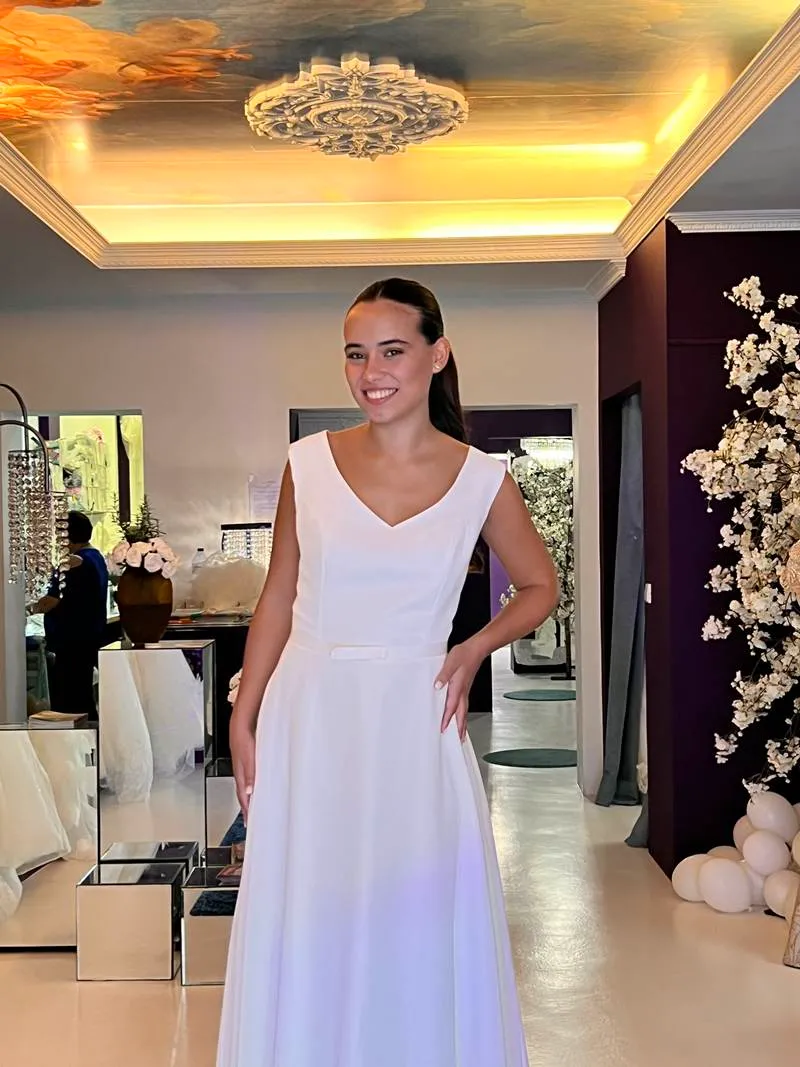 Vestido de noiva, corte em “A”, fluido, com ausência total de brilho, podendo eleger adereços e acessórios extra ao seu gosto, transformando o vestido para os vários momentos do seu dia.