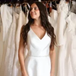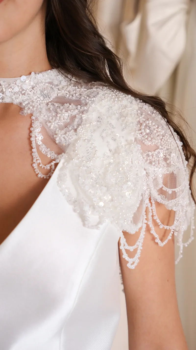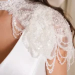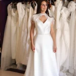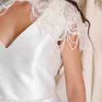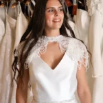 …Vestido corte em “A”, elegante e confortável com alças, dando a oportunidade da noiva eleger acessórios e adereços para distintos momentos do evento, como a gola e o cinto apresentados na imagem, que são extra.