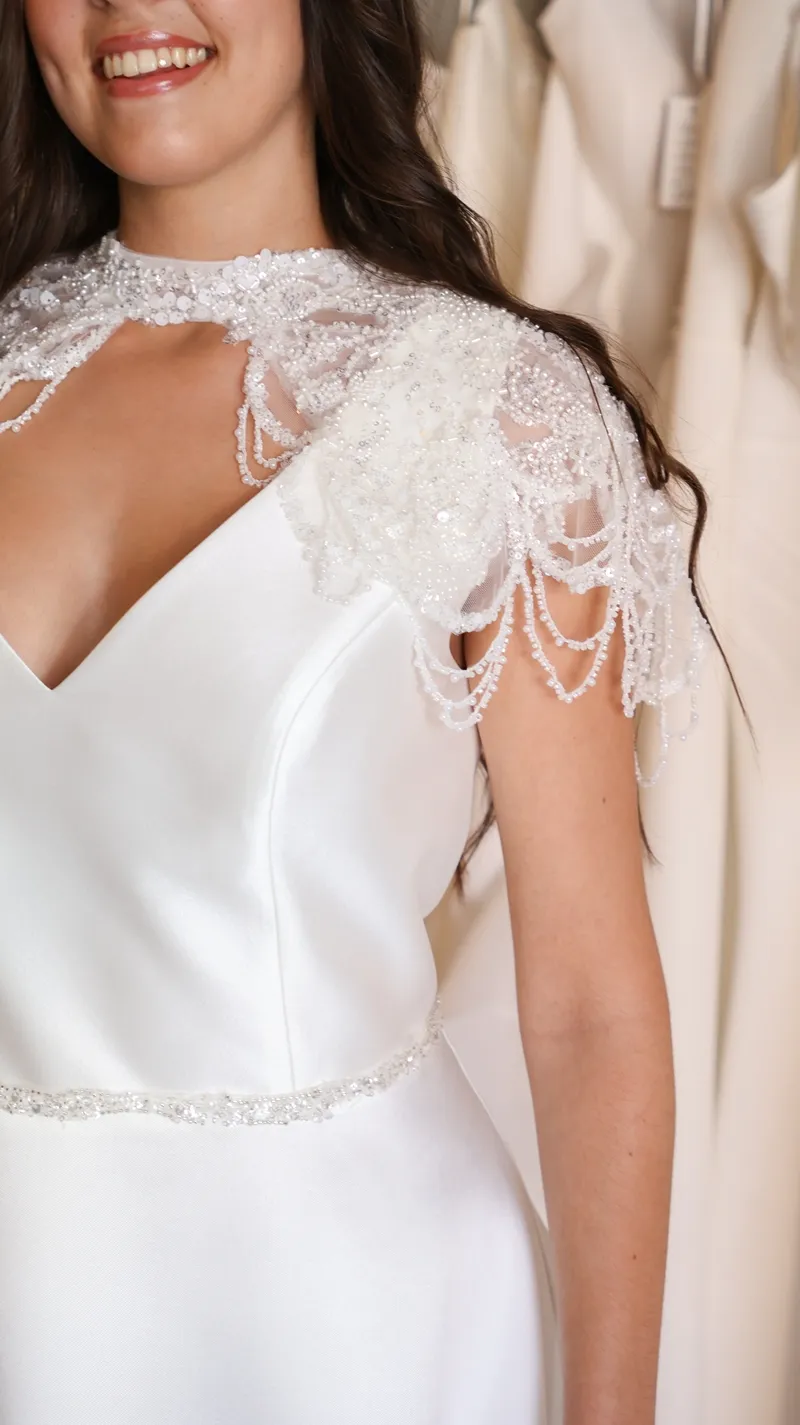 Vestido corte em “A”, elegante e confortável com alças, dando a oportunidade da noiva eleger acessórios e adereços para distintos momentos do evento, como a gola e o cinto apresentados na imagem, que são extra.