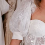 Vestido de noiva em renda richelieu, sereia aos gomos em tule de seda, podendo ter opção de mangas, gola e cinto.