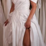 …Vestido rodado, assimétrico com uma abertura acentuada na frente, dando sensualidade e destaque à beleza das pernas e aos sapatos.