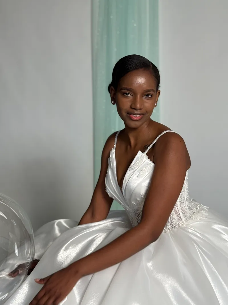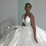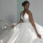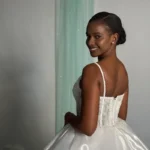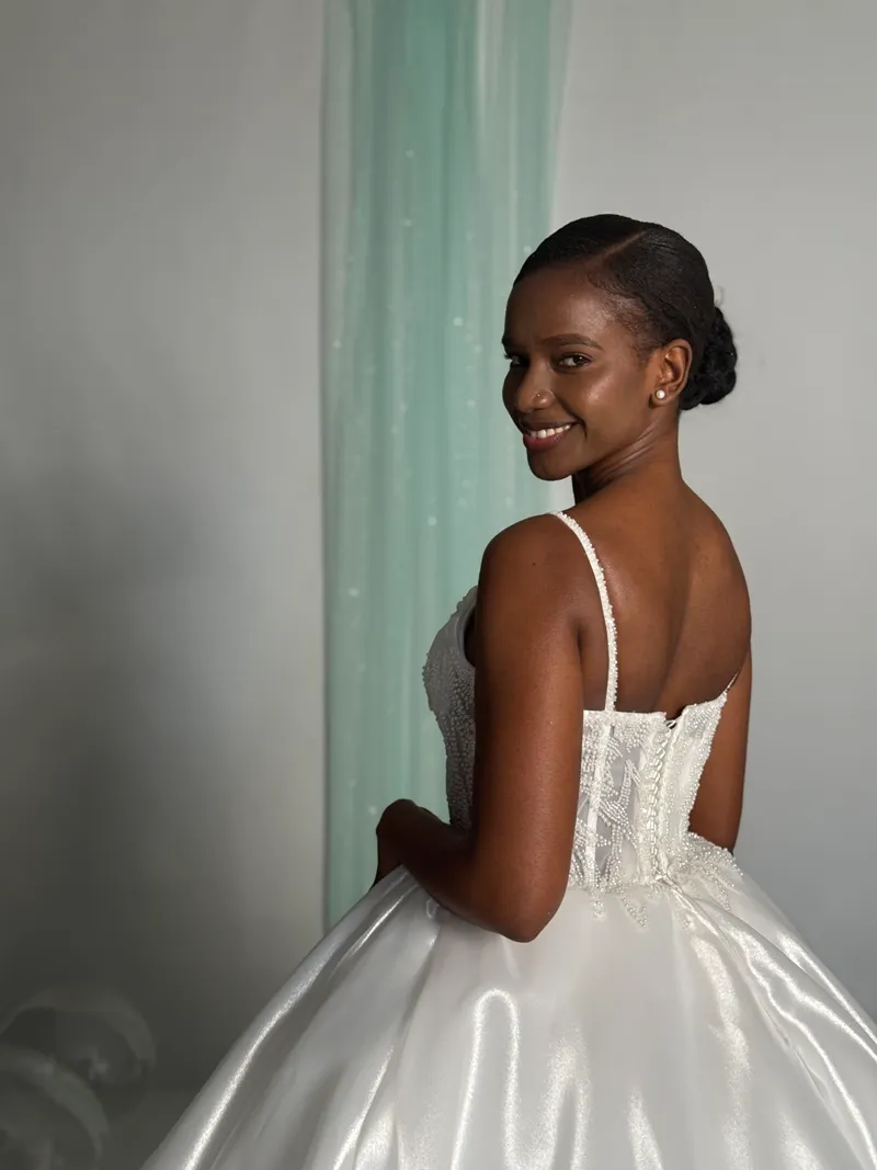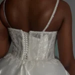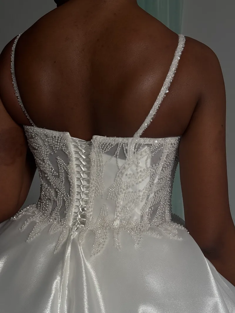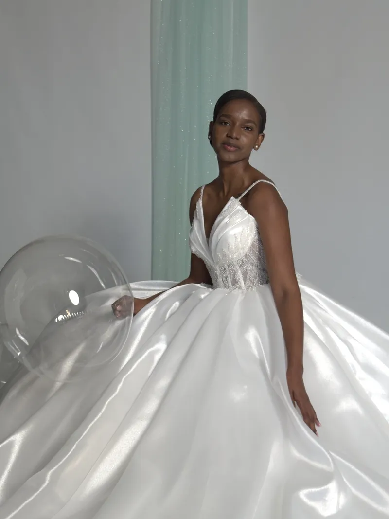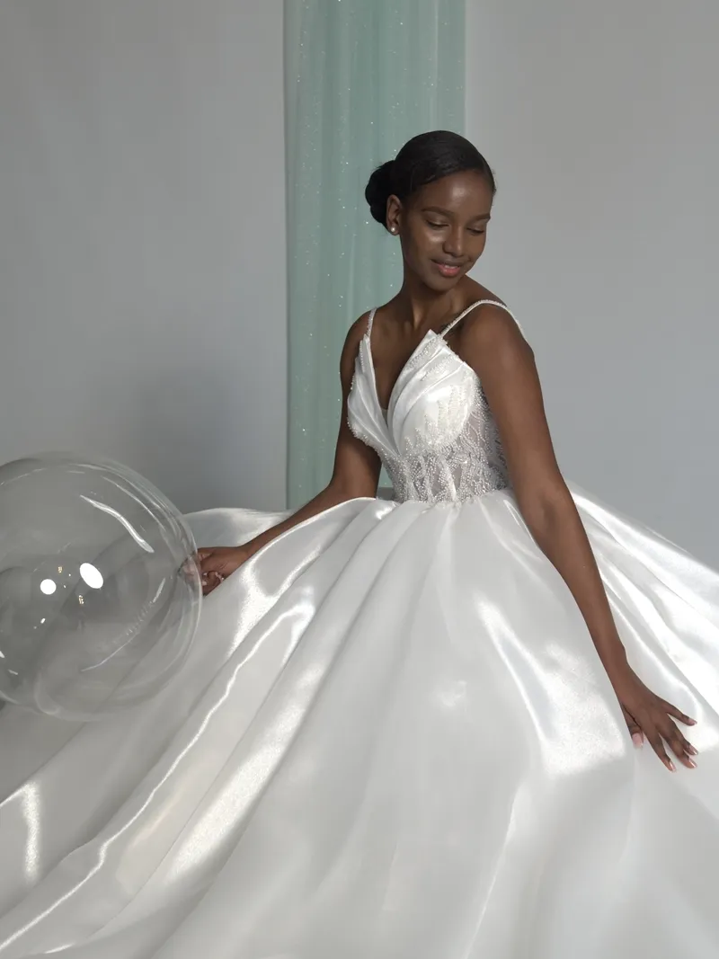 Um vestido volumoso e vaporoso, com camadas de organza e off-white que lembram a dança da espuma sobre o mar. O corpete estruturado contrasta com a fluidez da saia, criando um equilíbrio perfeito entre conto de fadas e modernidade. Corpete transparente e opaco, consoante a escolha da noiva. Vestido versátil em termos de transparências de corpete.